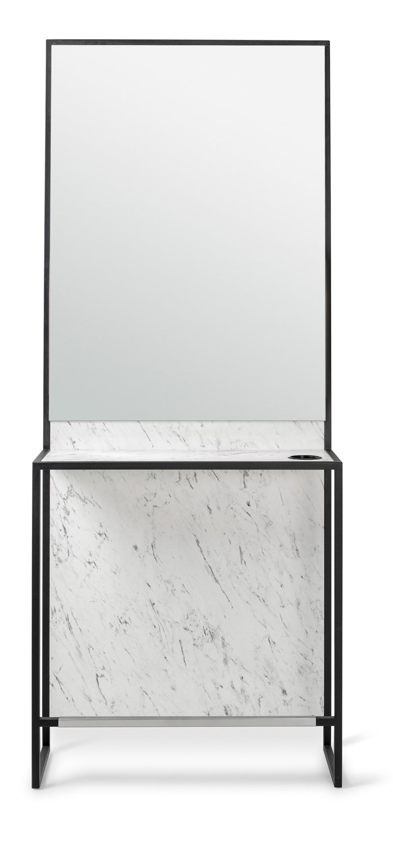The dressing table mirror takes up approximately the upper half of the piece of furniture. A short offset is followed by a practical shelf with an integrated opening for cables. The back panel extends down to the floor. At the front, a slightly raised bar provides the necessary comfort. Customers can place their feet comfortably without scratching the bar. A modern design was created with black bars. From the bottom with free side lengths to the very top around the mirror element, these frame the complete styling area.