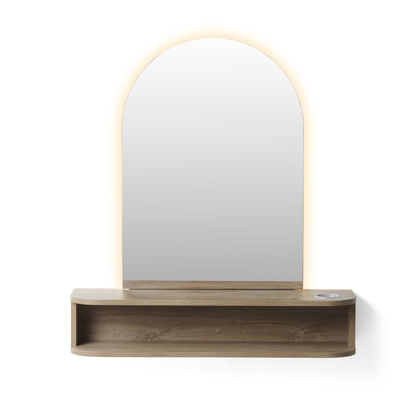 Eleganter Friseurspiegel aus der Cara Collection mit ovaler Form und integrierter Fönhalterbohrung. Die doppelte Ablage bietet praktischen Stauraum für Styling-Produkte und Accessoires direkt am Arbeitsplatz. Hochwertige Verarbeitung für den professionellen Salongebrauch. Ein zeitloses Design, das Funktionalität und Ästhetik vereint.