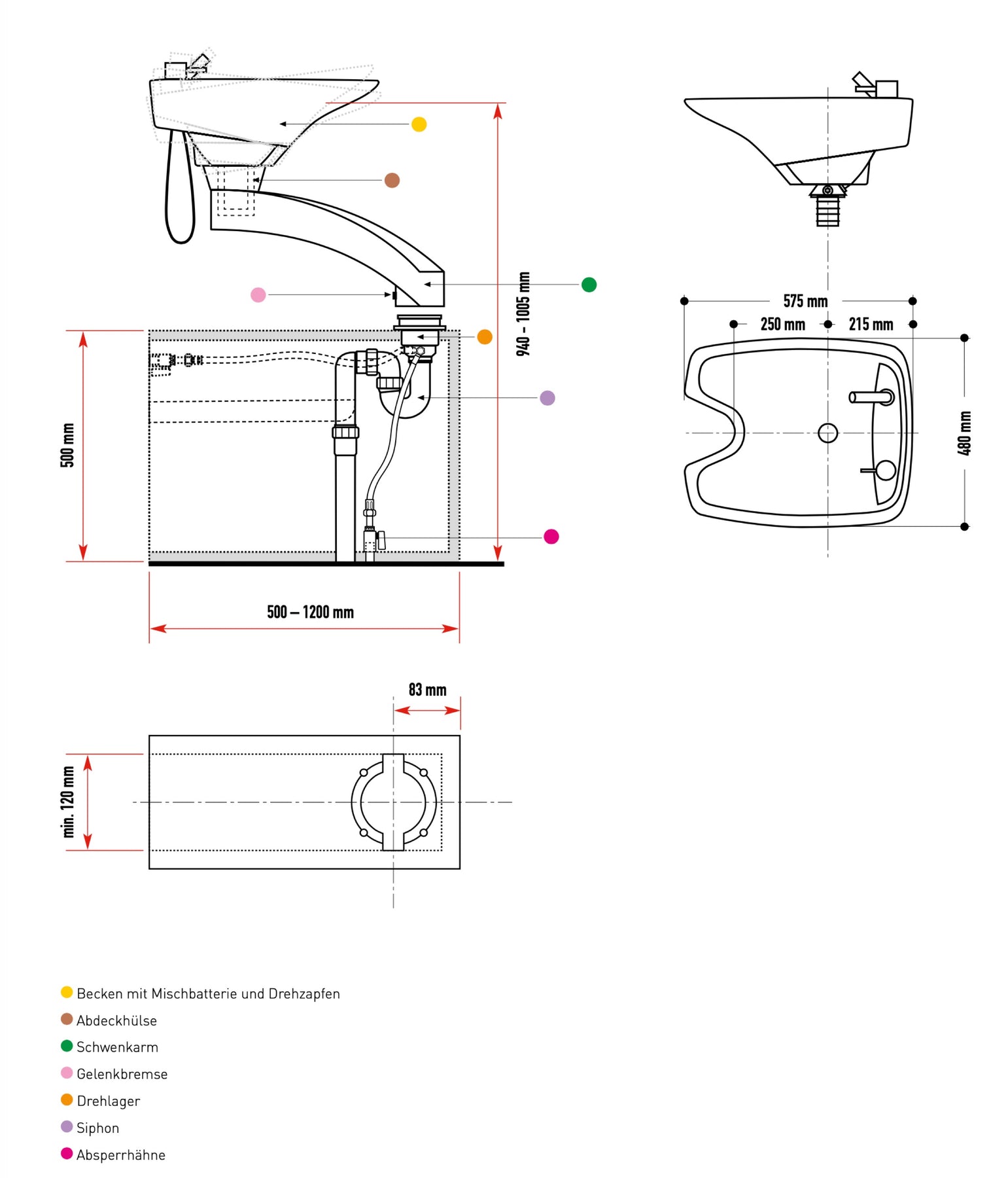 Das Grundgerät besteht aus stabilem Aluminiumguss, lackiert mit Polyurethanlack. Das Gelenk der Waschanlage ist 360° rundum drehbar ohne Anschlag, mit wartungsarmer Technik ausgestattet. Das dazugehörige Porzellanwaschbecken in weiß oder schwarz ist ebenfalls 360° rundum dreh- und kippbar, inkl. Einhebelmischbatterie AquaPLUS mit Keramikdichtung.