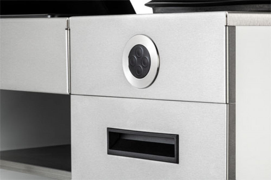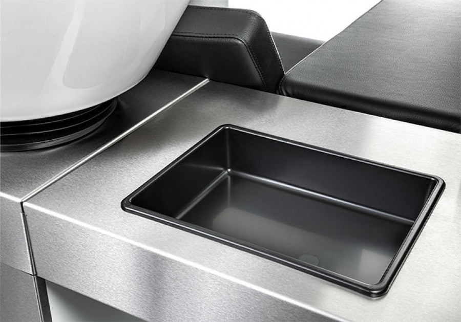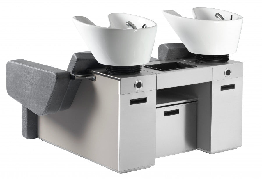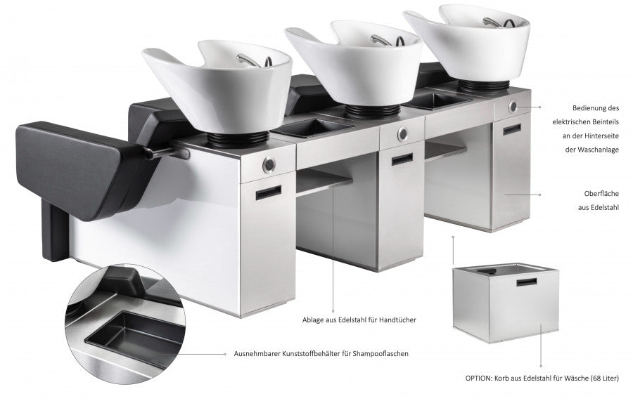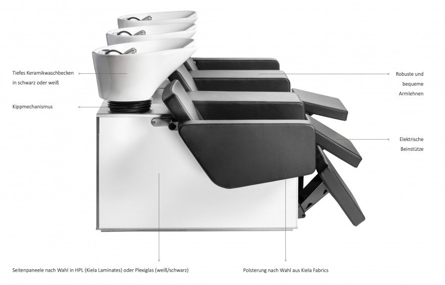 CHILL WASH-Waschanlage mit elektrischen Beinstützen. Bedienfeld an der Rückseite der Einheit. Keramik-Waschbecken mit Einhebelmischventil, integrierter Handbrause und abnehmbarem Siphon. Einschließlich Halsgummi. Seitenwände aus Plexiglas schwarz (Z) oder weiß (W) oder eine HPL-Farbe (H) nach Wahl von Kiela Laminates. Polstermöbel nach Wahl von Kiela Fabrics.